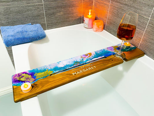 Personalized Resin & Wood Bath Caddy Tray – Custom Bathtub Wine & Candle Holder – Luxury Handmade Spa Gift for Her – Name Engraved Relaxation Board