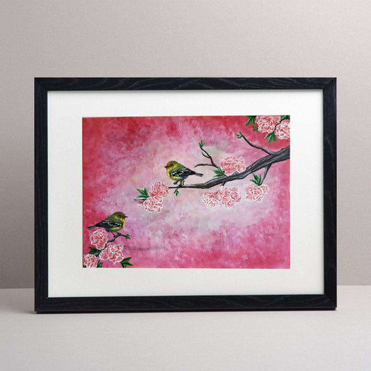 Hand-Painted Birds on Blossom Branch Wall Art – Pink Floral Canvas Painting, Nature-Inspired Home Décor, Unique Bird Lover’s Gift